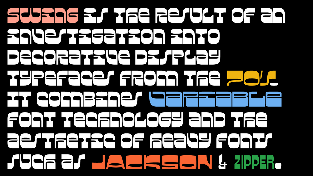 Swing is the result of an investigation onto decorative display typefaces from the 70โs. It combines variable font technology and the aesthetic of heavy fonts such as Jackson & Zipper.